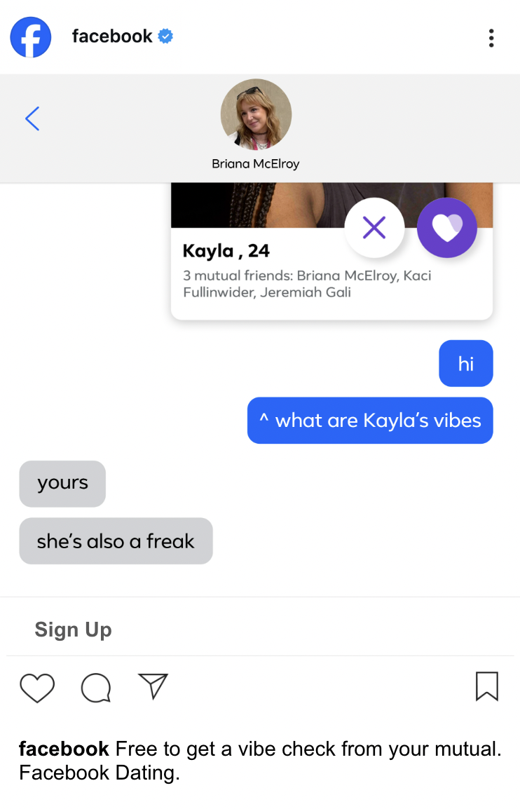 I led the creative team on this campaign we titled “Free to Date.” It pushes up against other dating apps that have pay-to-play features and relishes that Facebook Dating has NO paywalls. Just connections rooted in shared interests and mutual friends.
